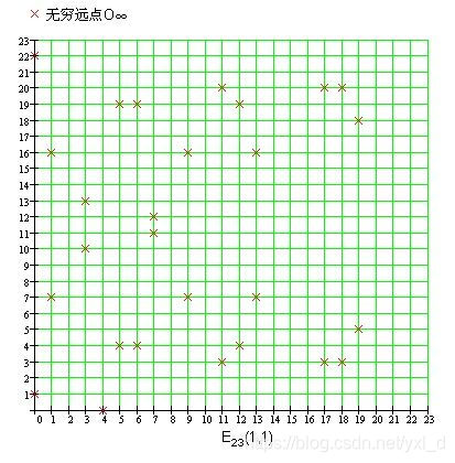 我们以y^2^=x^3^+x+1 (mod 23)为例,其在有限域上的的椭圆曲线图像如下所示: